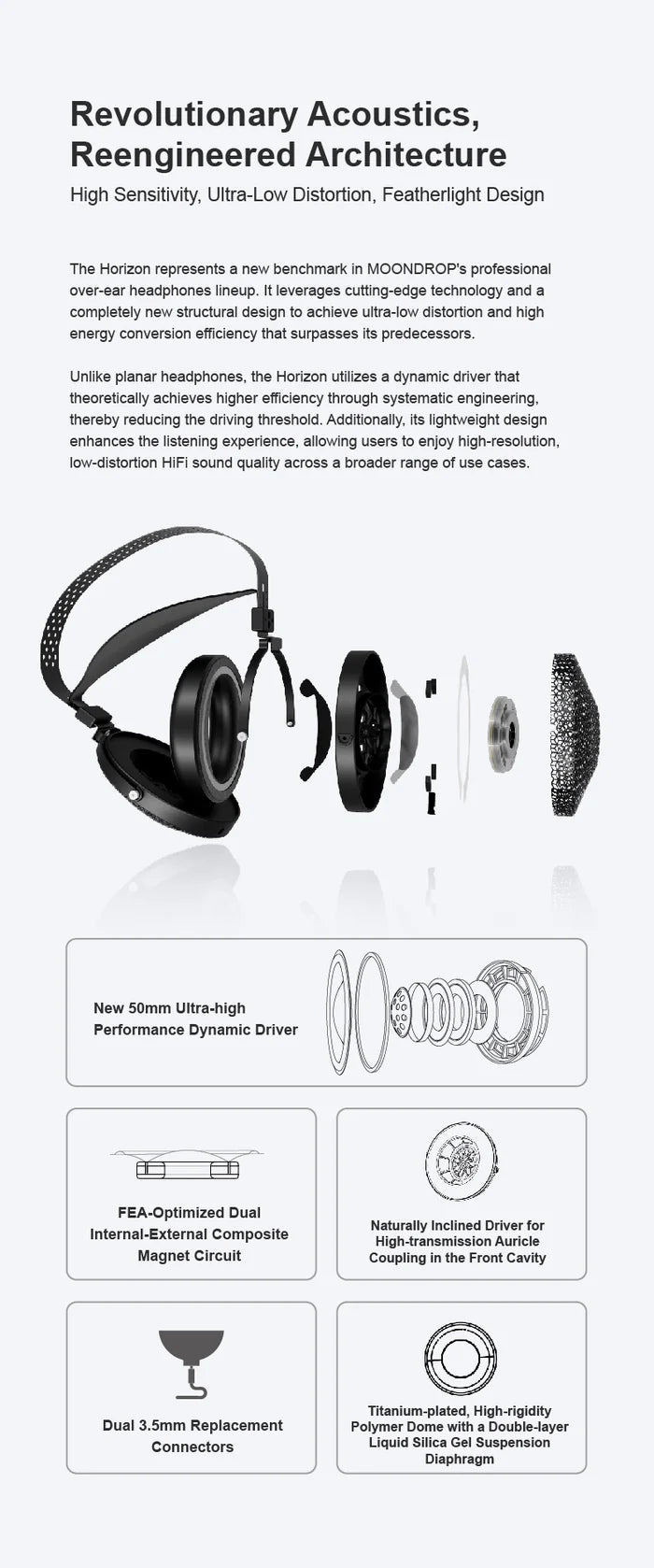 Los Horizon combinan un diseño ligero y un nuevo transductor dinámico ULT de 50 mm con doble imán de neodimio para ofrecer baja distorsión, escena inmersiva y una tonalidad rica y equilibrada. Son fáciles de mover desde un portátil o dongle, pero escala con equipos más serios: ideales tanto para quienes empiezan como para audiófilos experimentados.