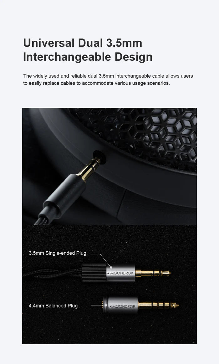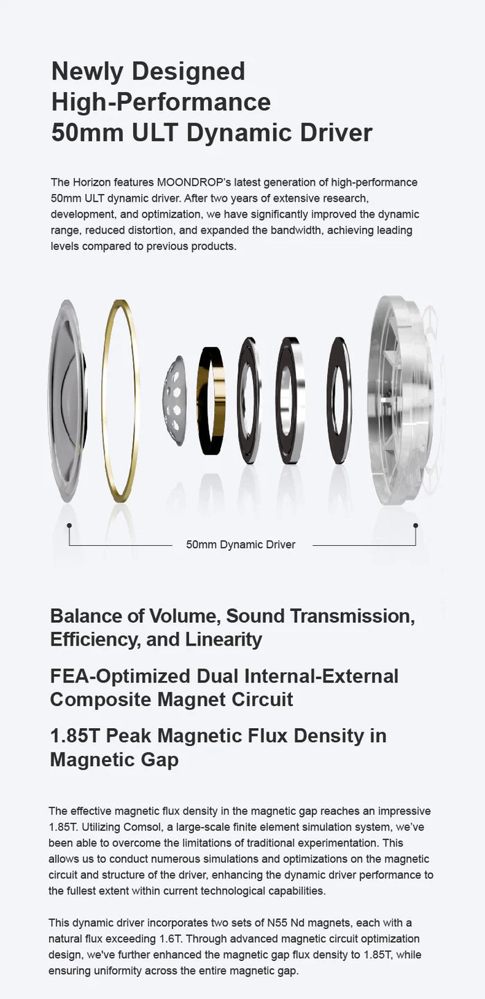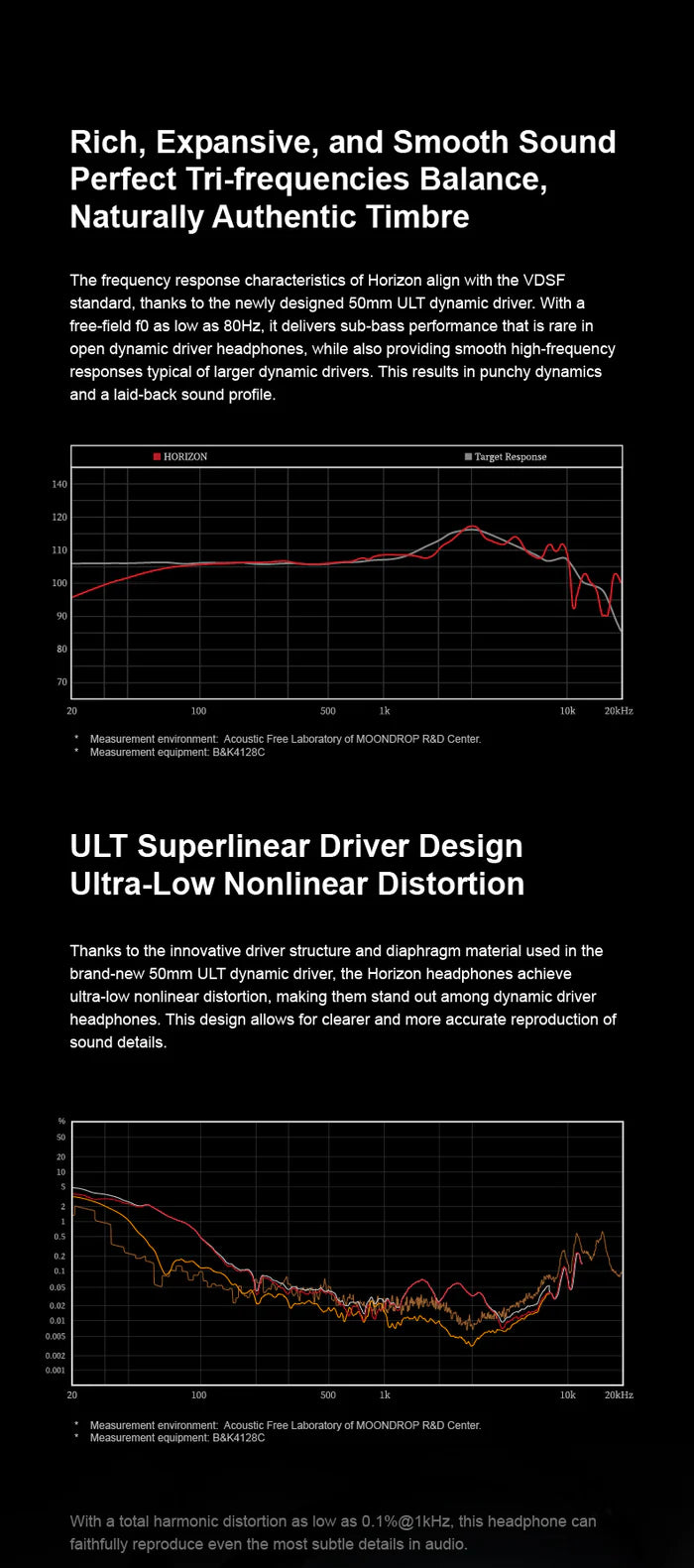 • Tuning VDSF de MOONDROP: firma equilibrada y relajada; subgrave con extensión en campo libre hasta 80 Hz (inusual en dinámicos abiertos); THD ≤ 0,1 % a 1 kHz (94 dB).