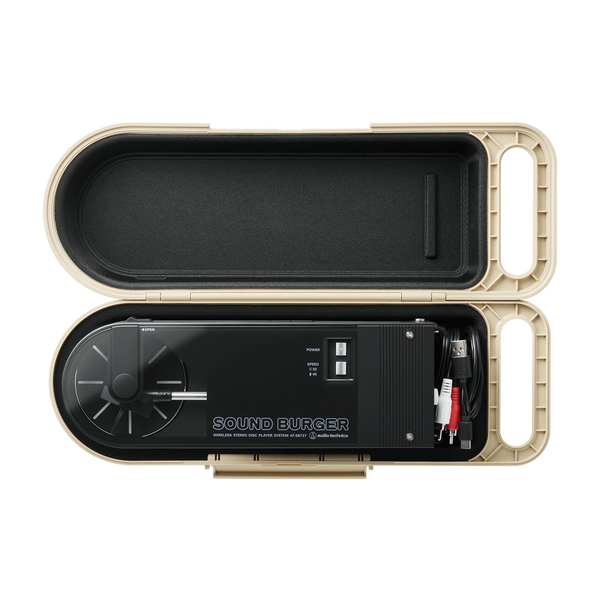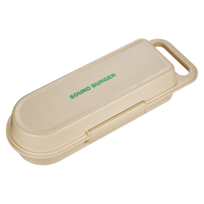 Disponible en beige, con el logotipo verde original de SOUND BURGER en la tapa, el AT-SBC1 combina practicidad y encanto vintage en un solo accesorio.