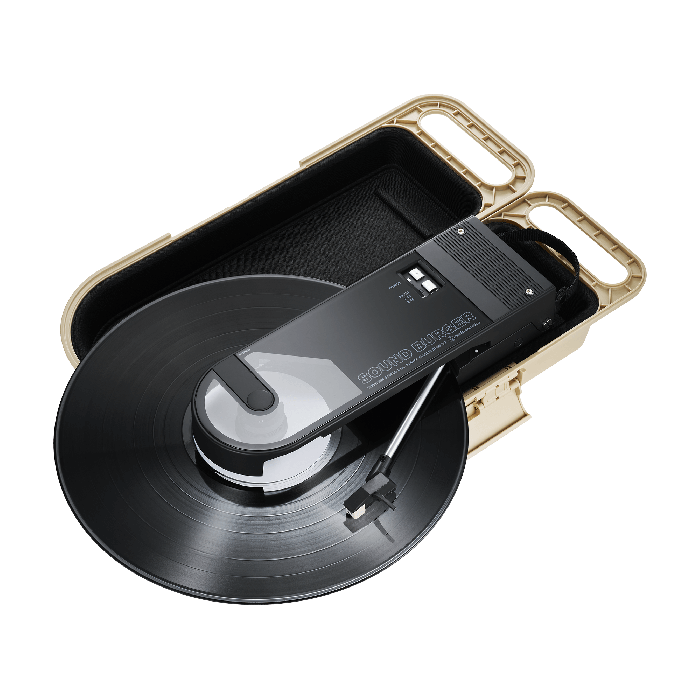 Su interior se ajusta perfectamente al contorno del Sound Burger, manteniéndolo seguro en todo momento. Además, permite reproducir discos y cargar el giradiscos sin necesidad de sacarlo del estuche. Incluye espacio adicional para guardar cables y accesorios, junto con un cierre a presión y una manija integrada que facilitan su transporte.